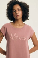 Prosty, luźny fason został uzupełniony o półokrągły dekolt oraz krótki rękaw, co czyni model niezwykle uniwersalnym i wygodnym. Przód koszuli zdobi delikatny napis, który subtelnie przełamuje minimalistyczny charakter całości i dodaje jej nowoczesnego akcentu. Długość przed kolano sprawia, że koszula prezentuje się lekko i kobieco, a jednocześnie pozostaje bardzo praktyczna.